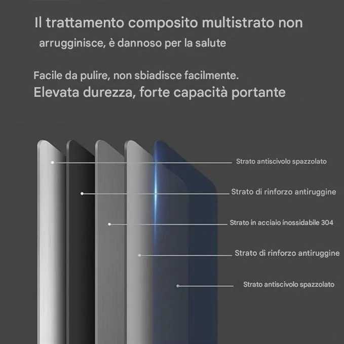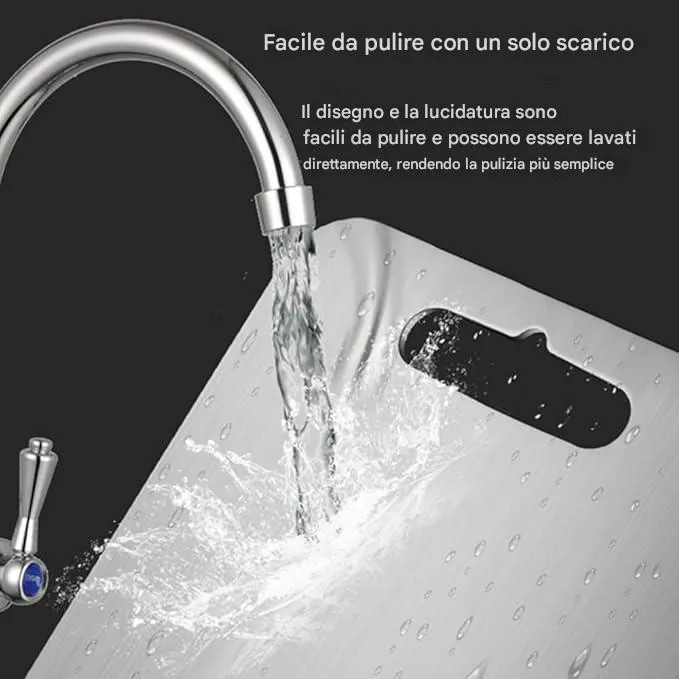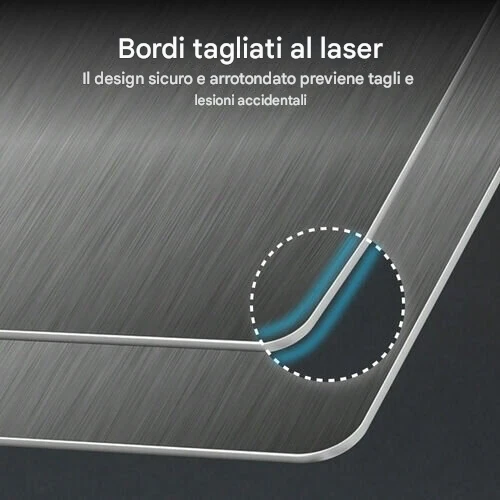 Sta benissimo in cucina! È robusto e non scivola, ha eliminato quel fastidioso rumore metallico ed è semplicemente facilissimo da pulire. Ho ufficialmente buttato via il mio vecchio tagliere di plastica e sono felice di non dover più affrontare graffi di plastica o accumuli di batteri.